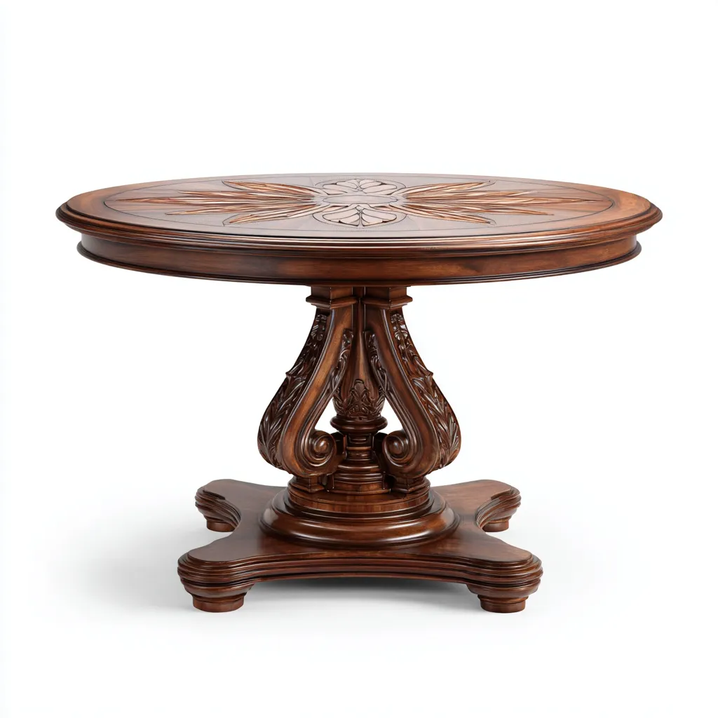 Dieser Gartentisch überzeugt durch seine runde Tischform und das dekorative Design der Tischplatte. Die massive Mittelsäule verleiht dem Tisch eine ausgewogene Stabilität und macht ihn zu einem stilvollen Mittelpunkt für Garten, Terrasse oder überdachten Außenbereich.
